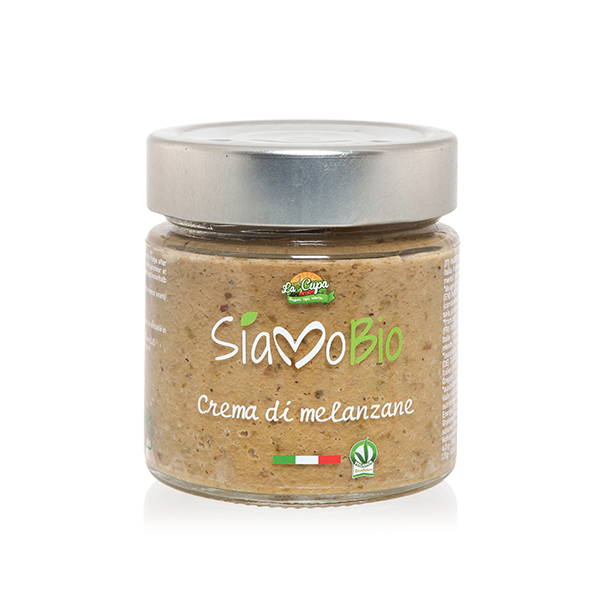 Bio-Auberginencreme, super vielseitig: hervorragend als Vorspeise, als Beilage zu Fleischgerichten, Sandwiches oder zum Genießen mit Toast. Veganes Produkt. Ohne Konservierungsstoffe. Super vielseitig: